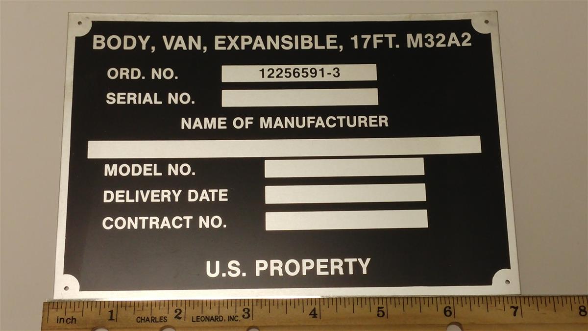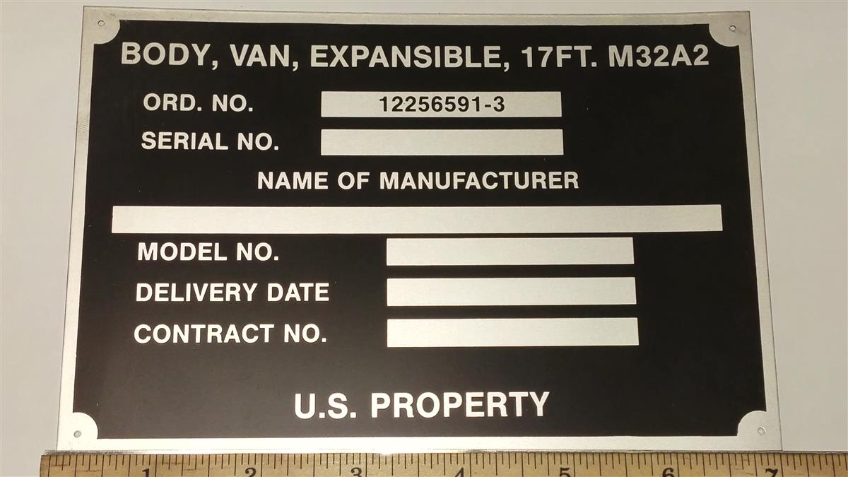 M32-A2 Expansible VanTruck Body Data Plate NSN: 9905-01-210-0219 PN: 12302962